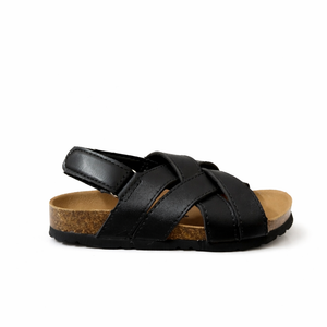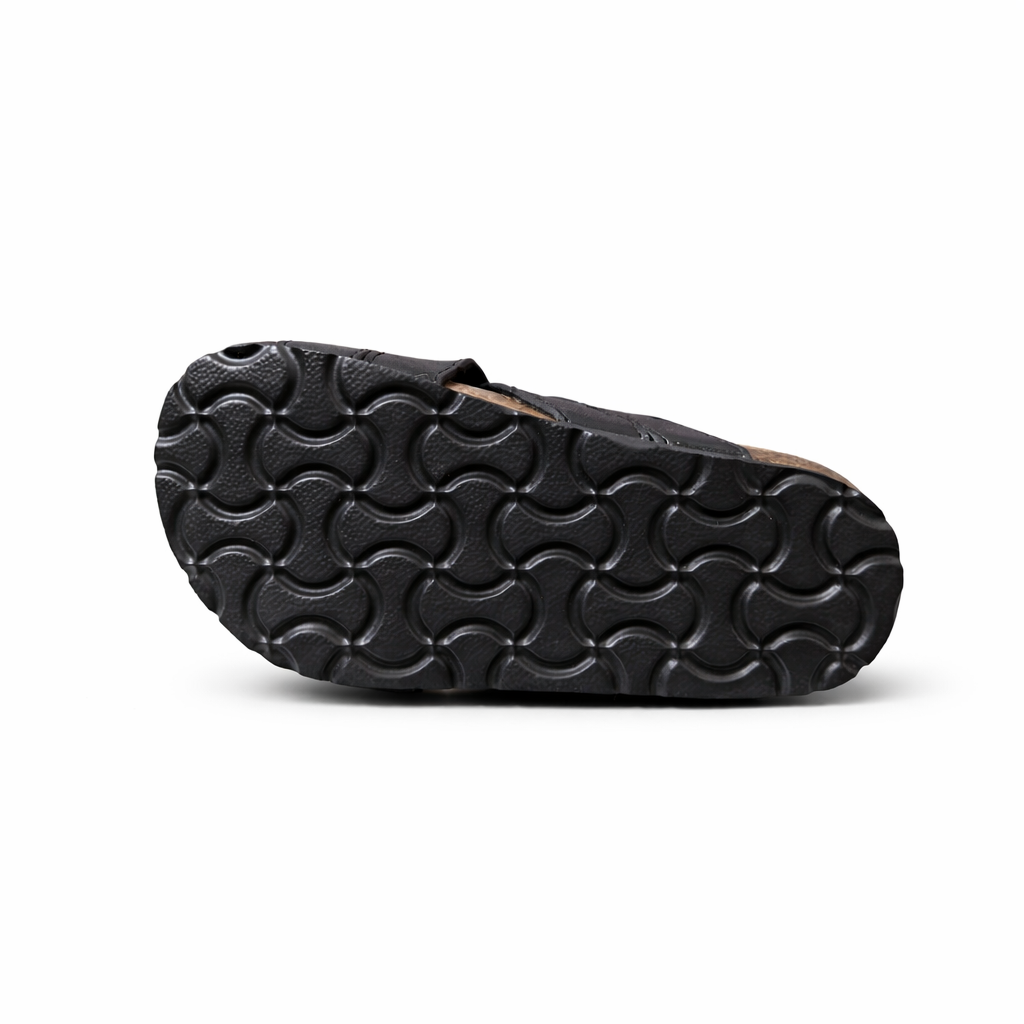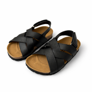 The cross-strap upper holds the foot securely, while the cushioned cork-style footbed provides natural support during walking. A back strap helps keep the sandal stable, making it suitable for outdoor play, school use, and casual outings.